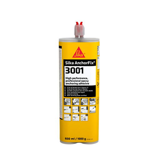 Sika AnchorFix®-3001 es un adhesivo epoxi, tixotrópico, de dos componentes, libre de solventes para anclajes de alta capacidad de carga de barras conformadas y barras roscadas en hormigón fisurado y no fisurado.