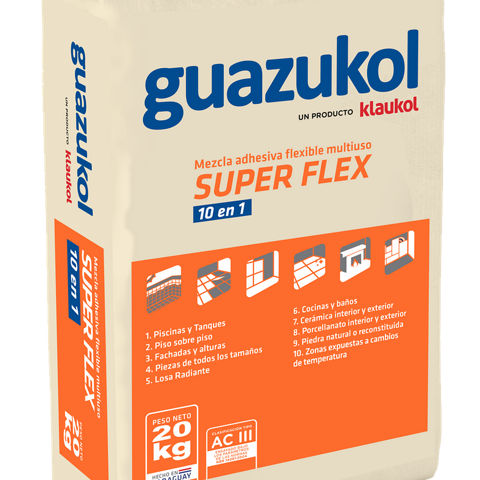 Adhesivo cementicio tipo C-3 flexible y multipropósito, 10 en 1. Monocomponente, listo para usar, se mezcla solo con agua, es aplicable en interiores y exteriorres, en superficies verticales y horizontales, posee deslizamiento reducido y un alto nivel de adherencia.